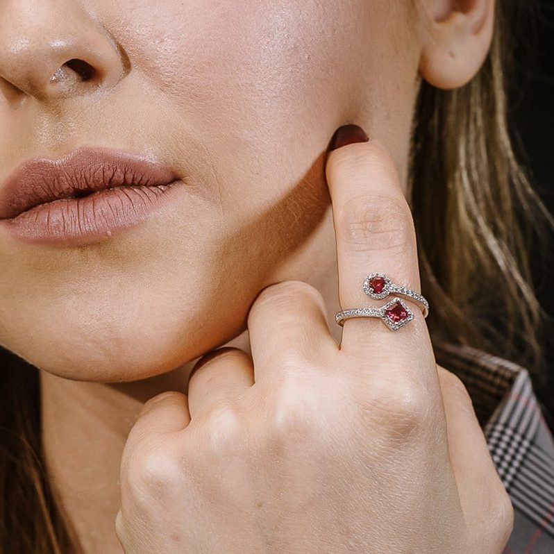 טבעת אלמנט עגול ומשולש זרקנים ורודים משובצת זירקונים מכסף 925 טהור לאישה. הטבעת משובצת בזירקוני AAAA בחיתוך יהלום. מצופה ברודיום להגנה מפני התחמצנות ושריטות. המוצר מגיע באריזת מתנה מהודרת וממותגת! חצי שנה אחריות.