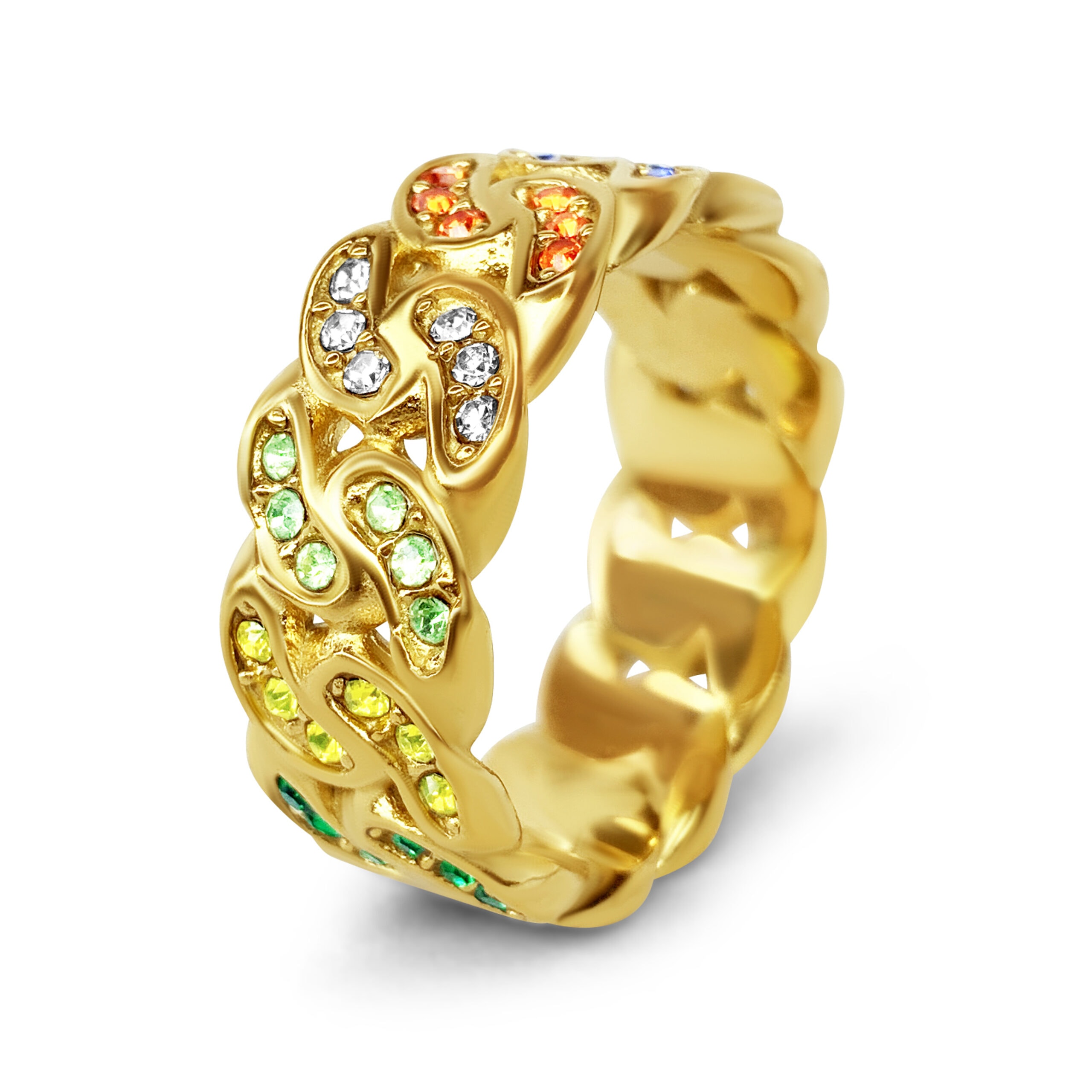 הטבעת משובצת בזירקונים צבעוניים. הטבעת עשויה מפלדת אל חלד, לא משחירה ולא מחלידה.