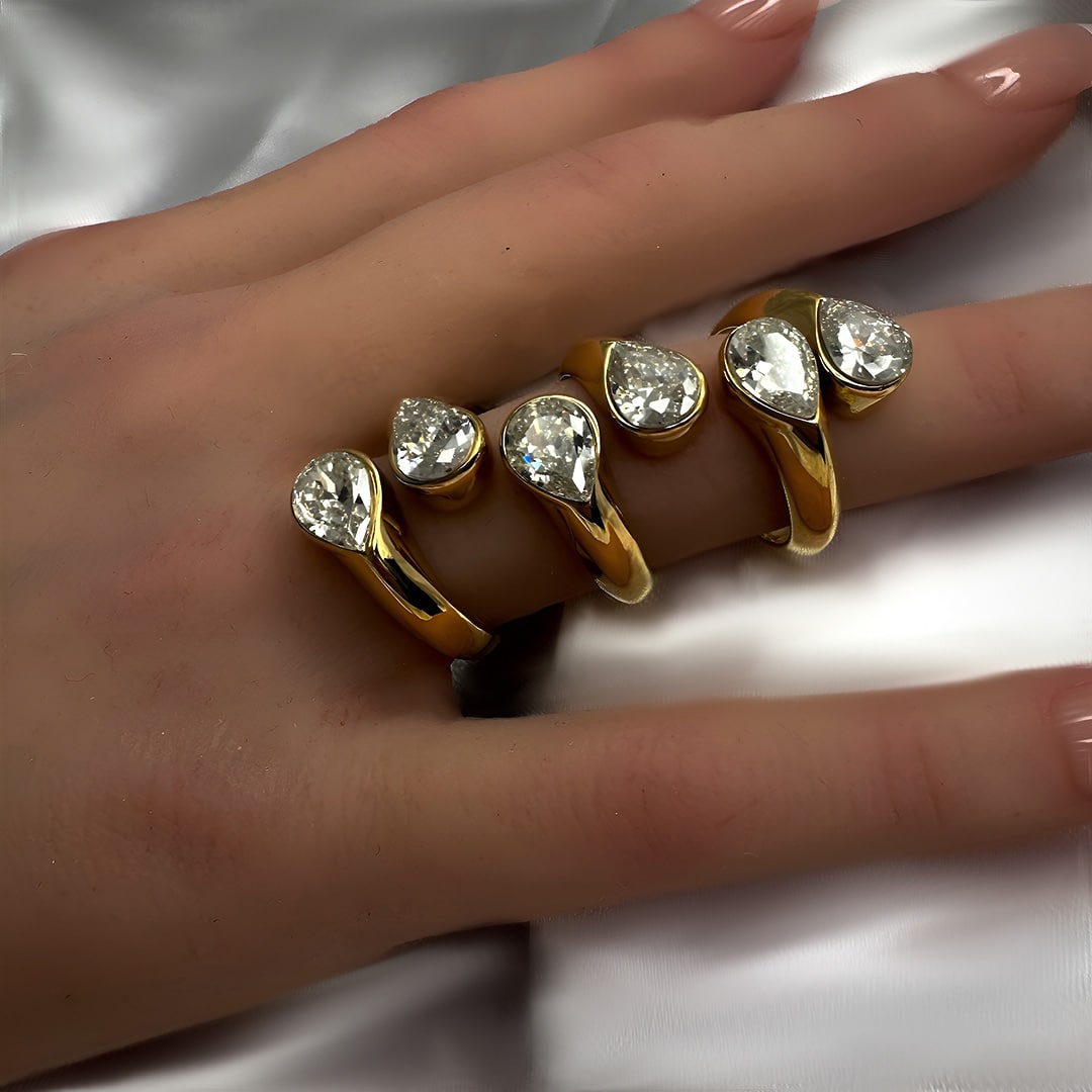 צורתה הפתוחה של הטבעת מאפשרת התאמה לכל מידת אצבע. היא מותאמת לשימוש בבריכה ובים ללא חשש. הטבעת משובצת בזירקונים גדולים בצורת טיפות, והיא מגיעה באריזה מהודרת וממותגת. ברכישת הטבעת תקבלו חצי שנת אחריות וכן מטלית לניקוי תכשיטים ללא עלות.