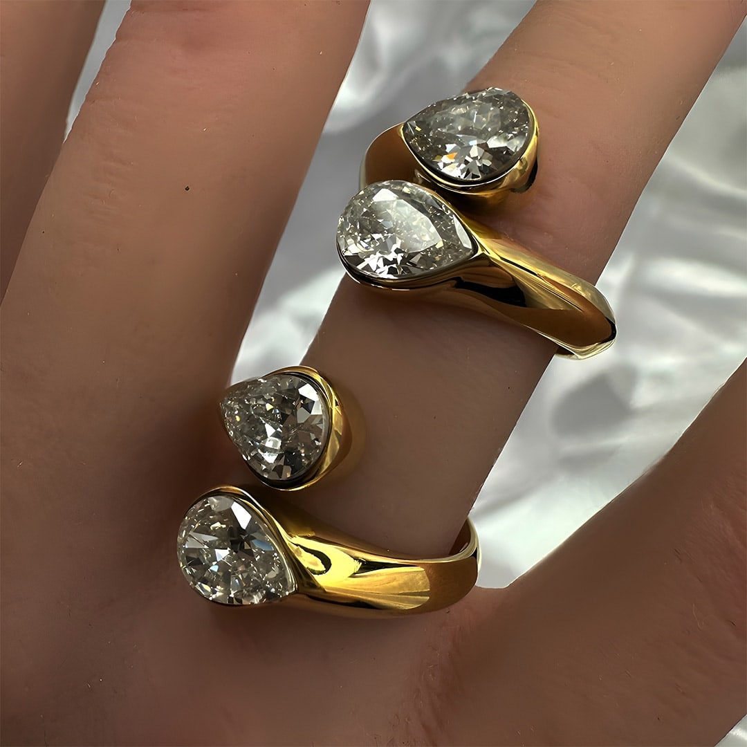 שני זירקונים בהירים ובוהקים, משובצים בטבעת בצורת טיפות משתלבות, רוקדים ריקודי אינסופי של קסם ויופי, הטיפות הצמודות זו לזו משדרות הרמוניה ושלמות.