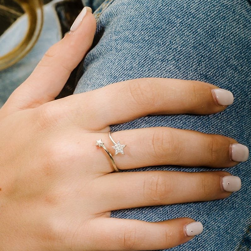 טבעת כוכבים גמישה, כוכב משובץ זירקונים מכסף 925 טהור לאישה. הטבעת משובצת בזירקוני AAAA בחיתוך יהלום. מצופה ברודיום להגנה מפני התחמצנות ושריטות. המוצר מגיע באריזת מתנה מהודרת וממותגת! חצי שנה אחריות.
