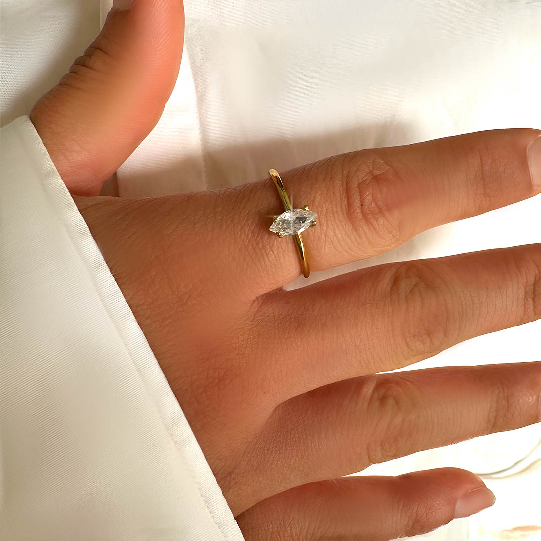 טבעת סוליטר מרקיזה פתוחה – הטבעת משובצת בזירקון בצורת מריקזה, הטבעת פתוחה ולכן מתאימה לכל המידות