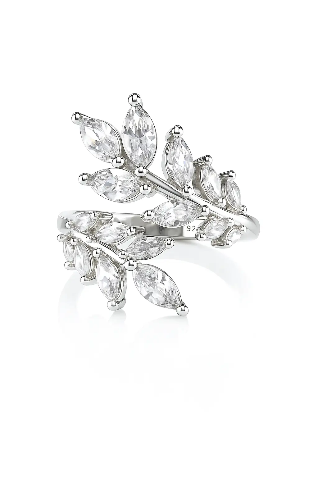 טבעת פתוחה מכסף 925 משובת זירקונים בצורת מרקיז המדמים עלים עדינים שמטפסים סביב האצבע.