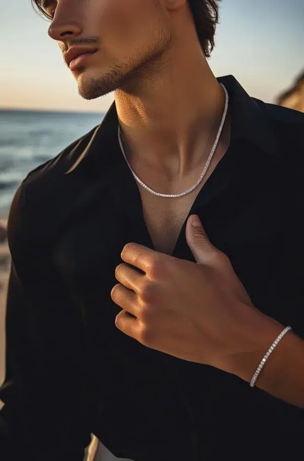 סט אייס בעיצוב עדין, שרשרת משובצת זירקונים נוצצים בעובי 3 מ"מ שהונחו בעבודת יד וצמיד טניס 3 מ"מ. ניתן להרטיב את הסט.