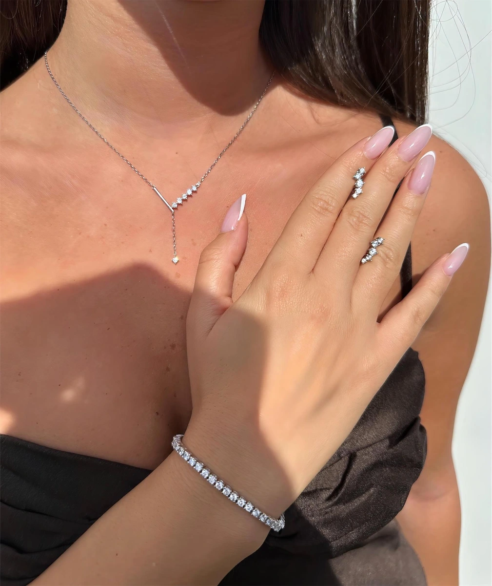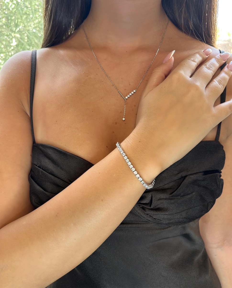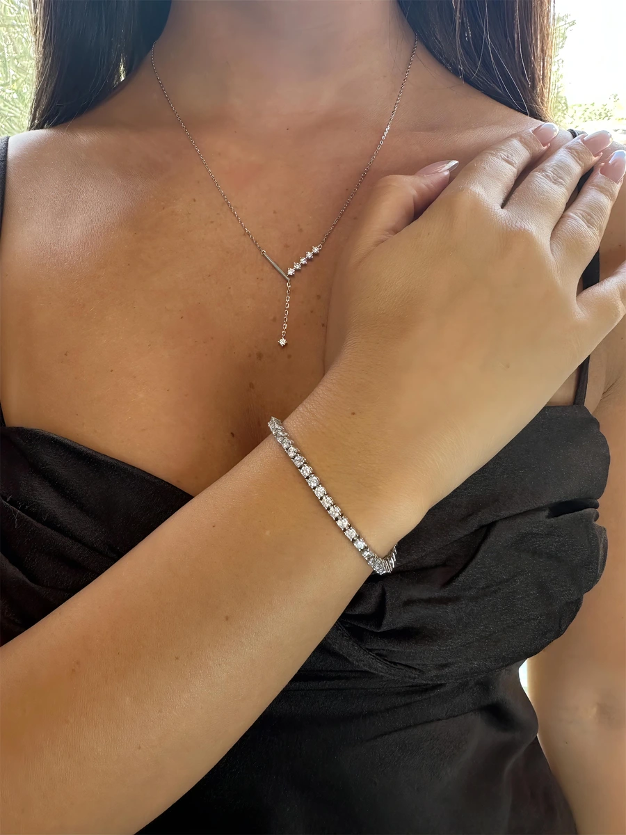 שילוב הרמוני של שרשרת עניבה עדינה, עגילים צמודים קלאסיים ו־צמיד טניס גמיש עם הארכה.