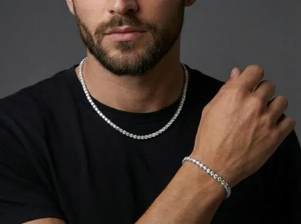 הסט כולל: שרשרת טניס אייס בעובי 4 מ"מ, משובצת בזירקונים עבים בעבודת יד לגבר