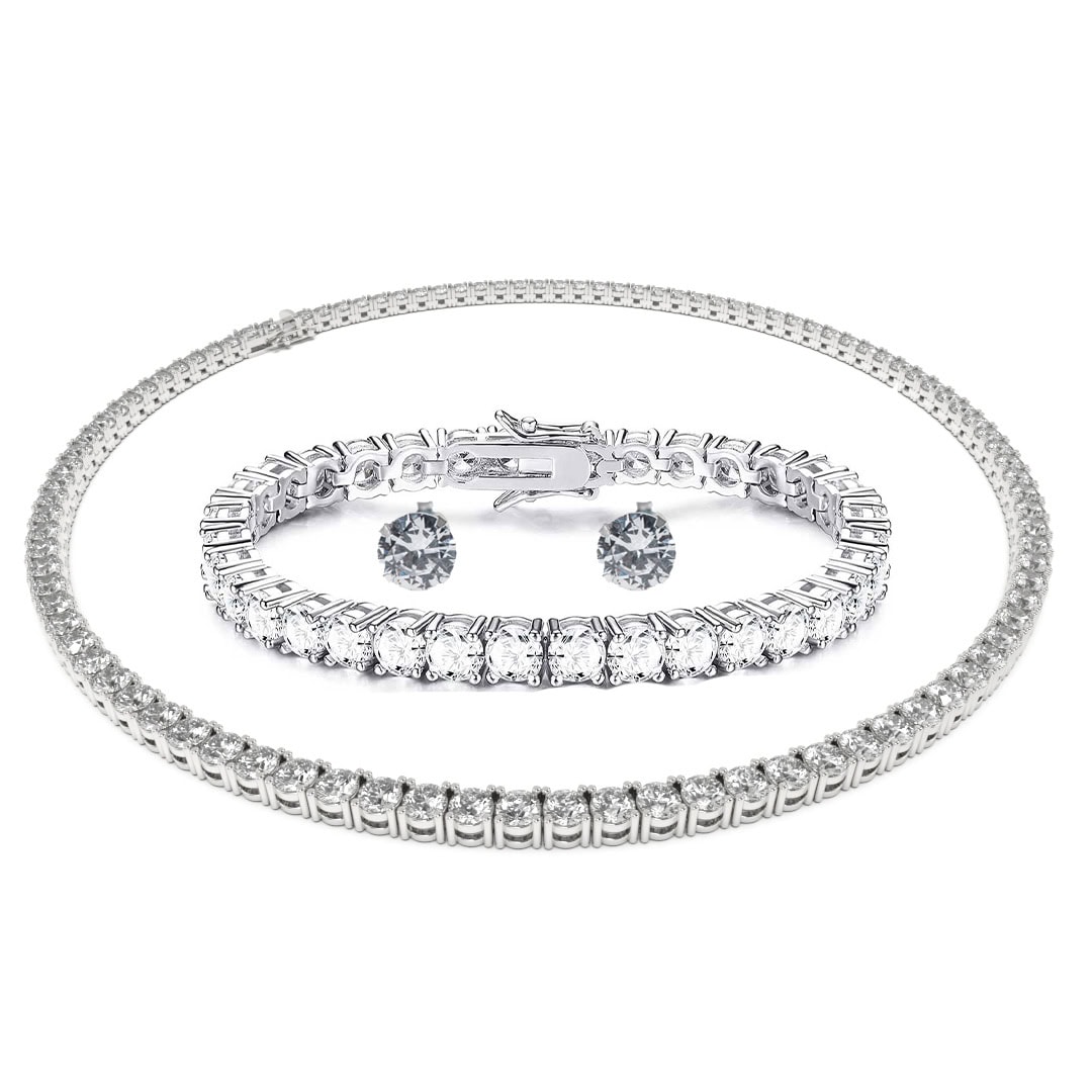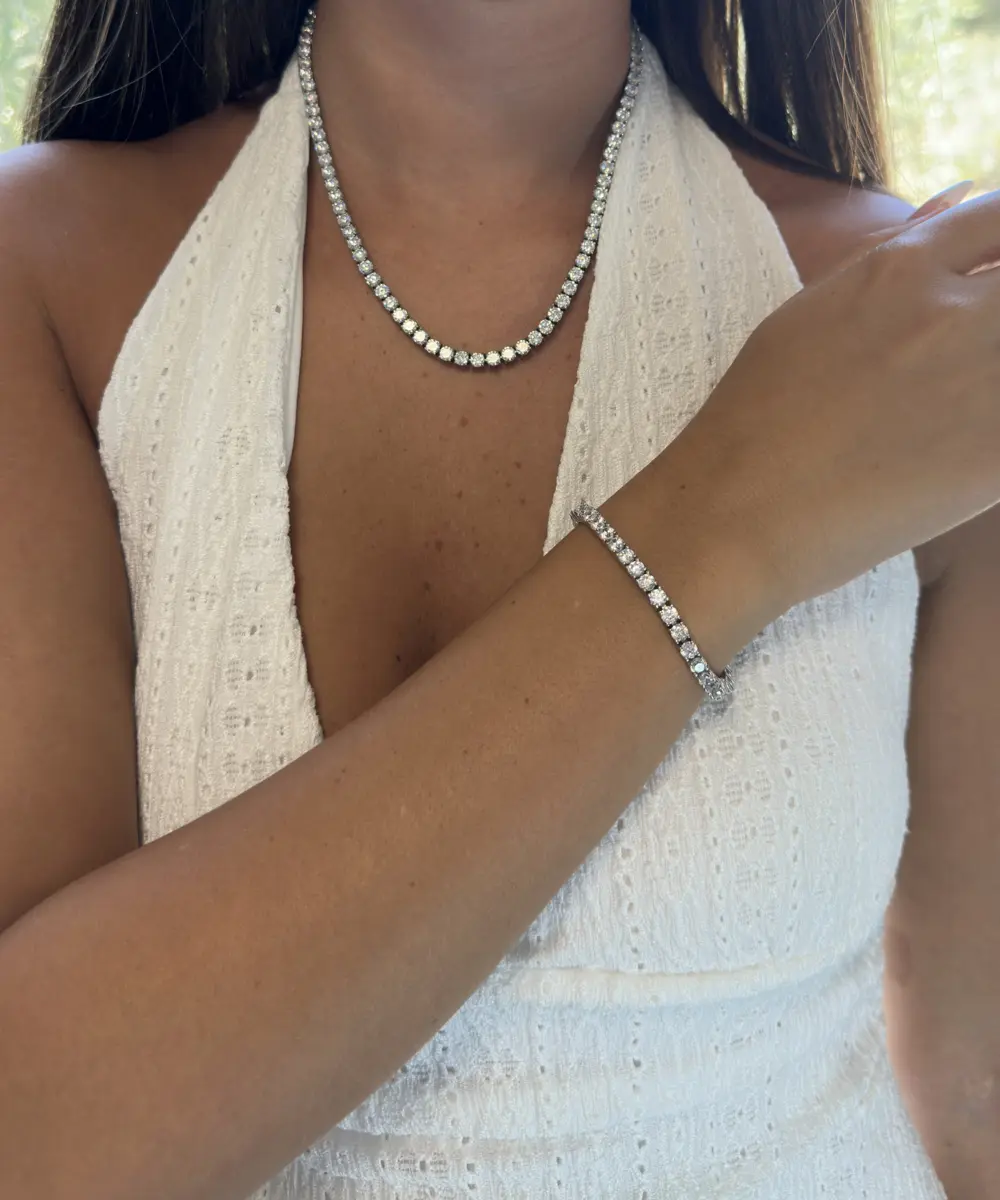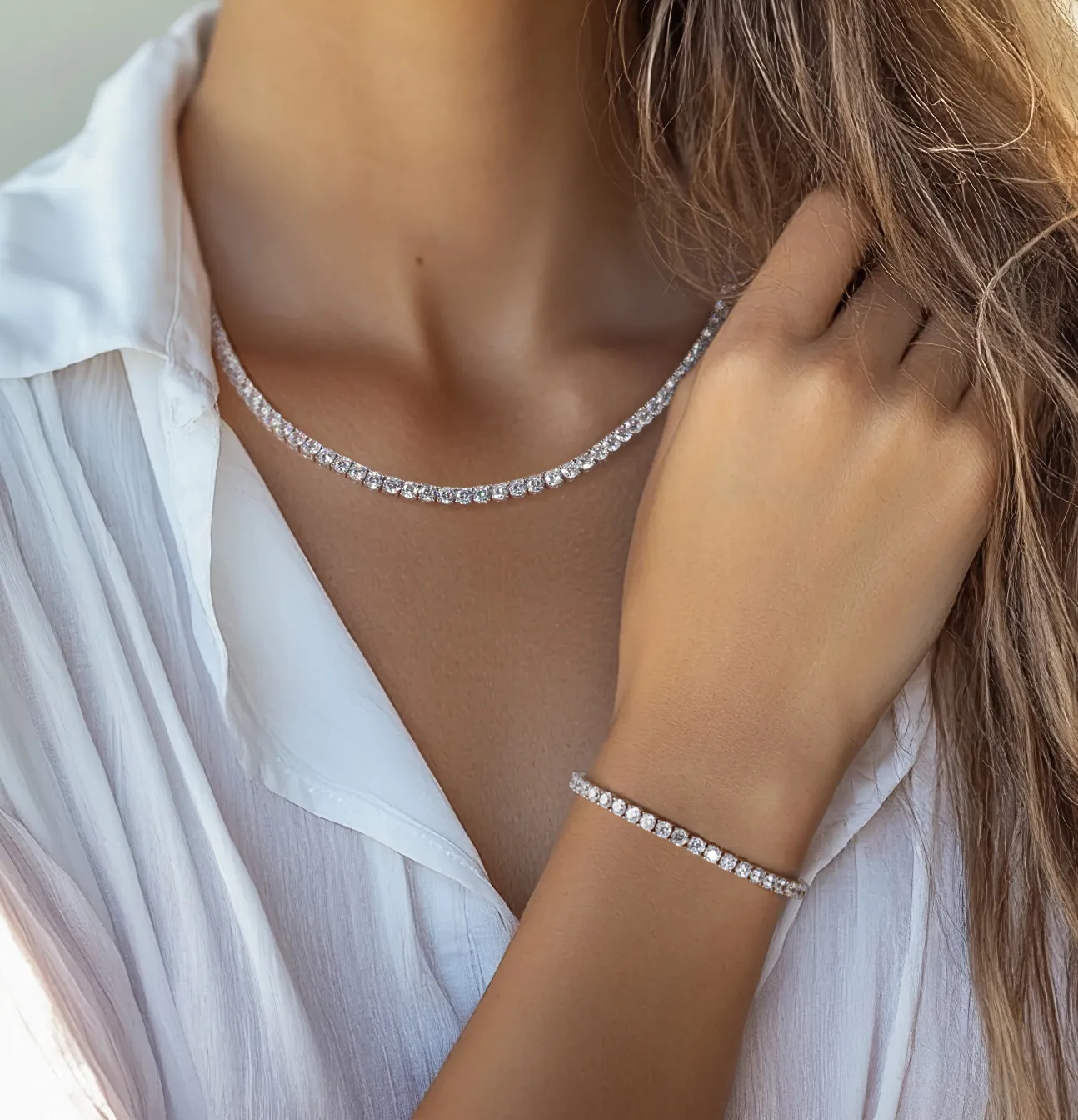 הסט כולל בתוכו שרשרת וצמיד טניס עבים וזוג עגילים.
