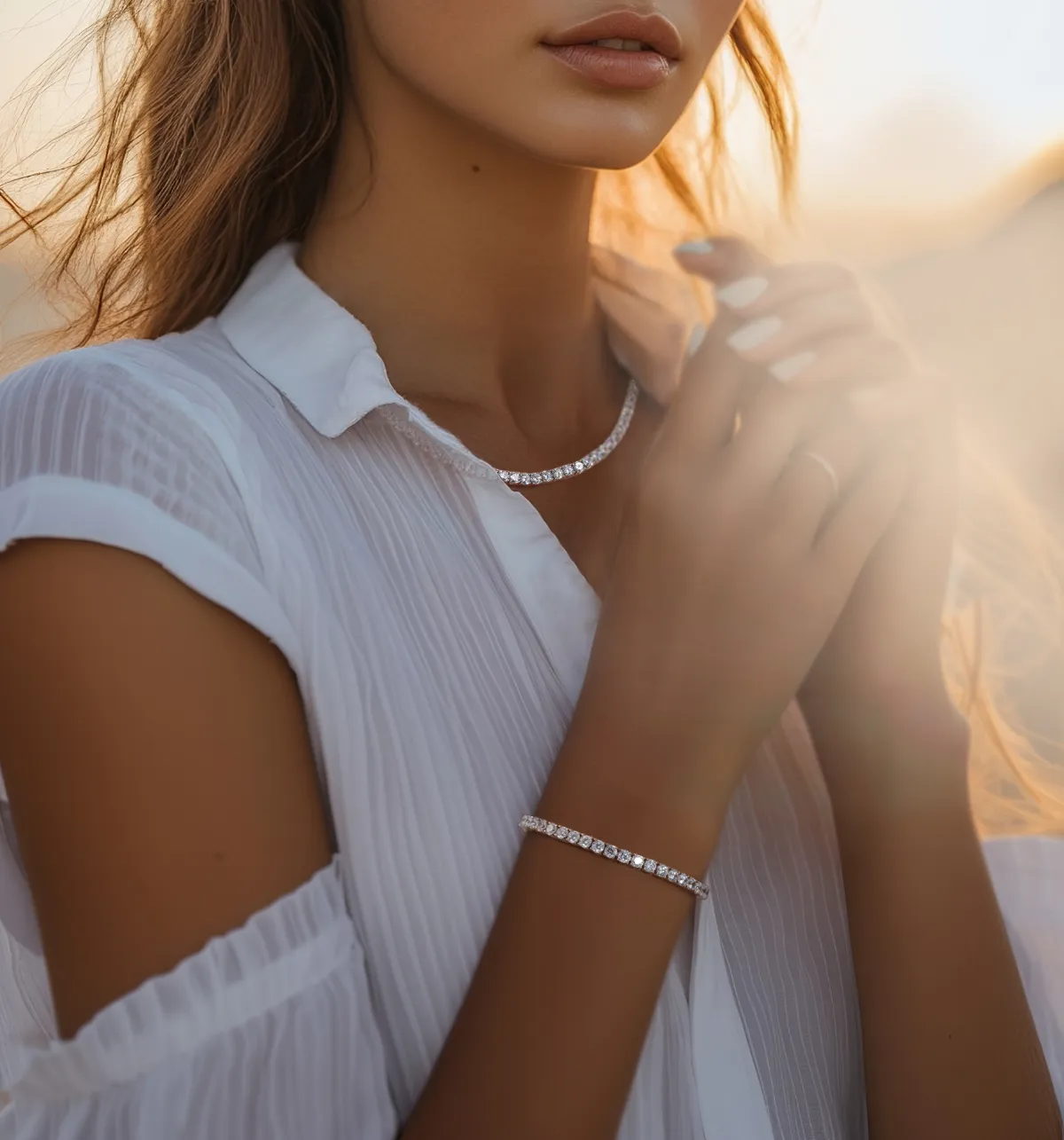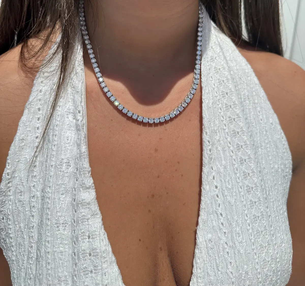 הדוגמנית עונדת שרשרת טניס מידה 40 ס"מ.