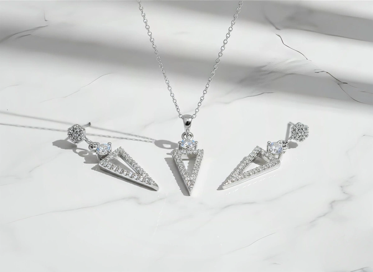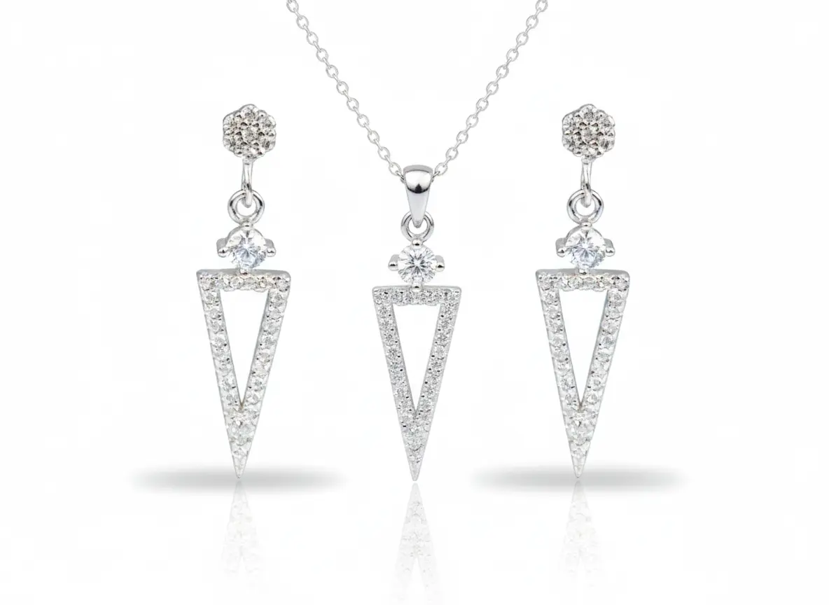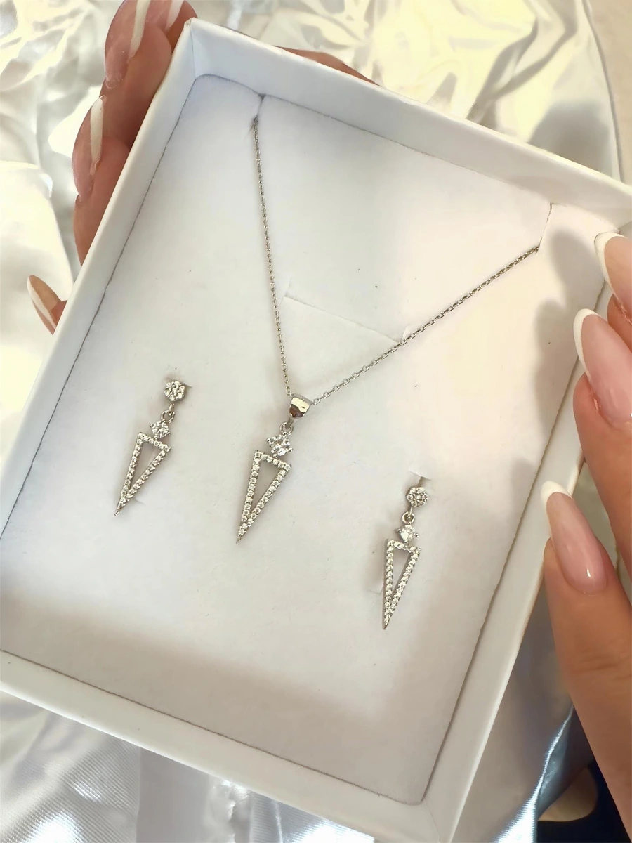 סט משולשים נופלים מכסף לאישה – שרשרת ועגילים.