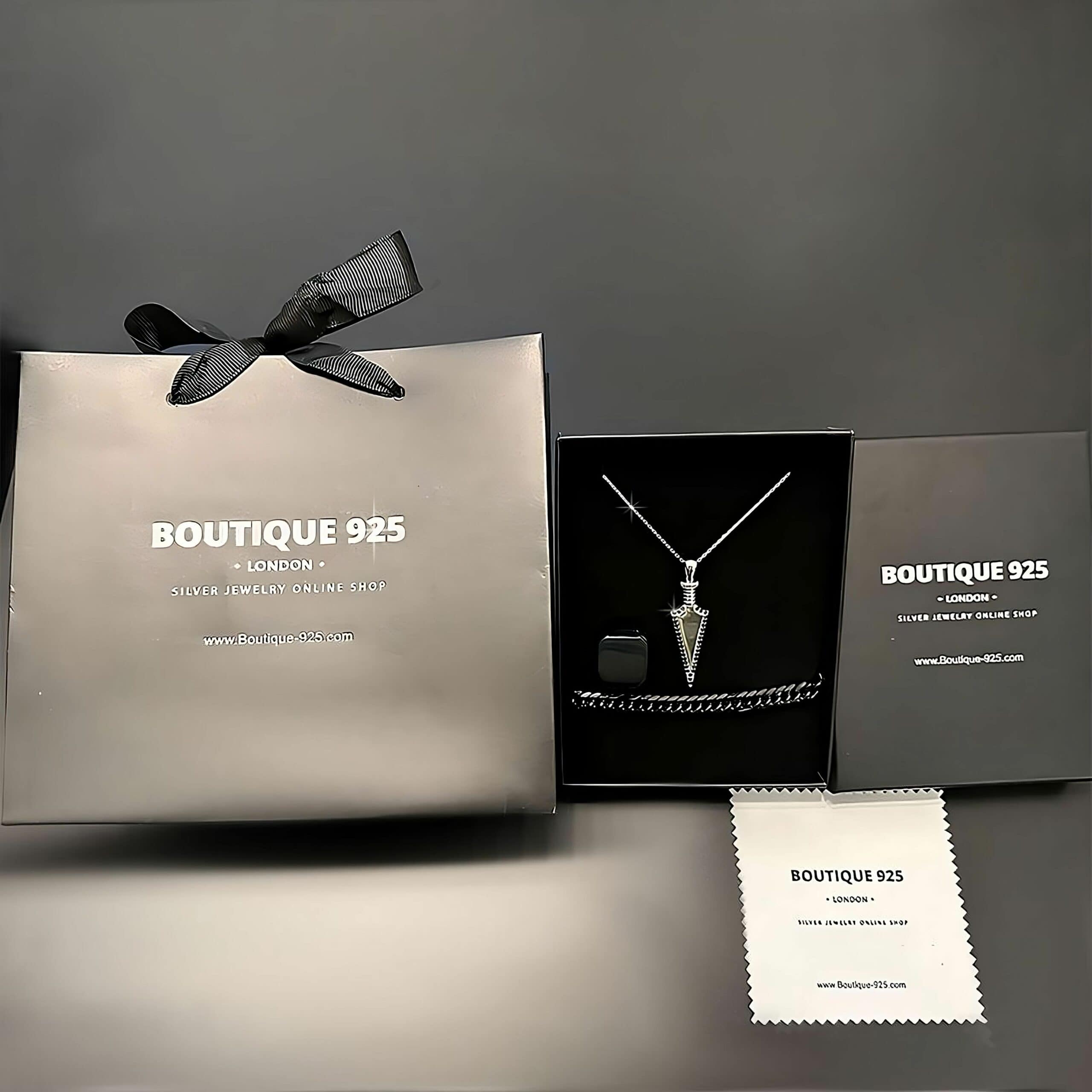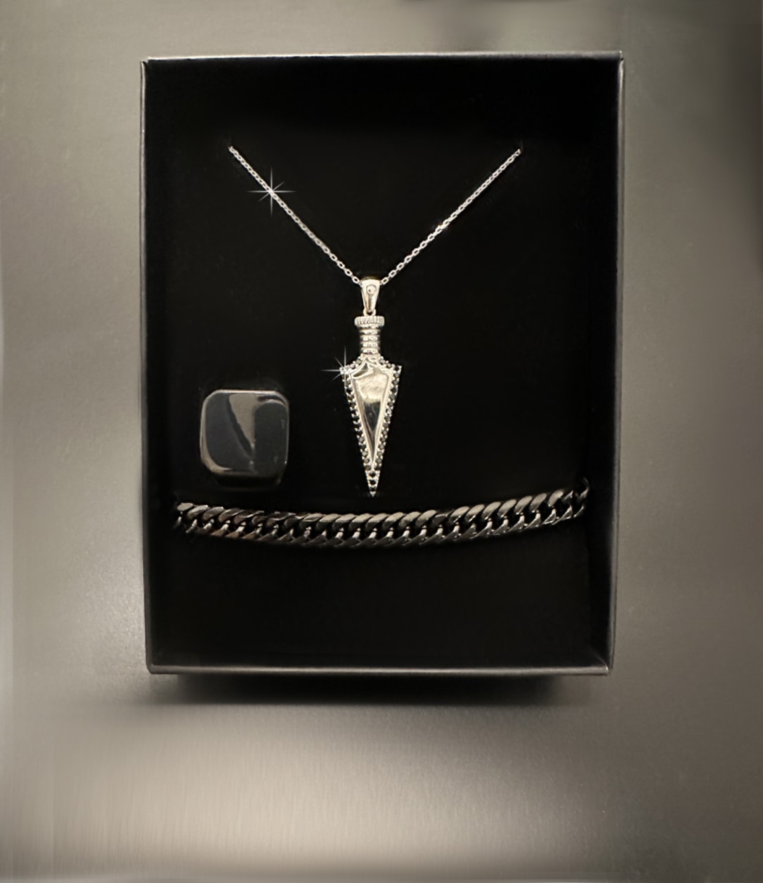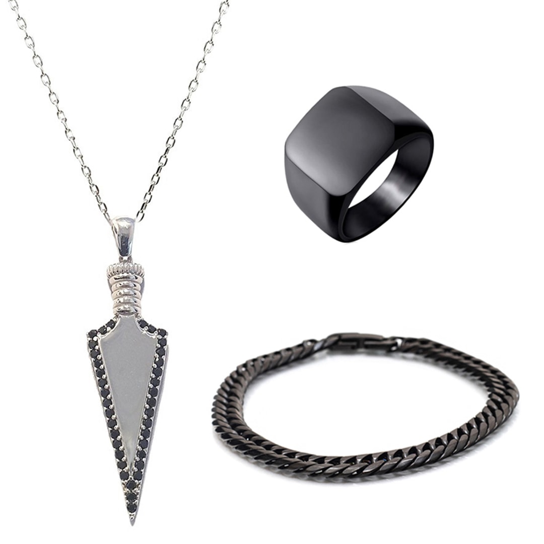 סט Darkness שרשרת צמיד גורמט וטבעת לגבר החץ עשוי מכסף 925 משובץ בזירקונים שחורים, הגורמט והטבעת עשויים פלדת אל חלד בלתי משחירה/מחלידה. הסט מגיע באריזת מתנה ממותגת ומהודרת! חצי שנה אחריות.