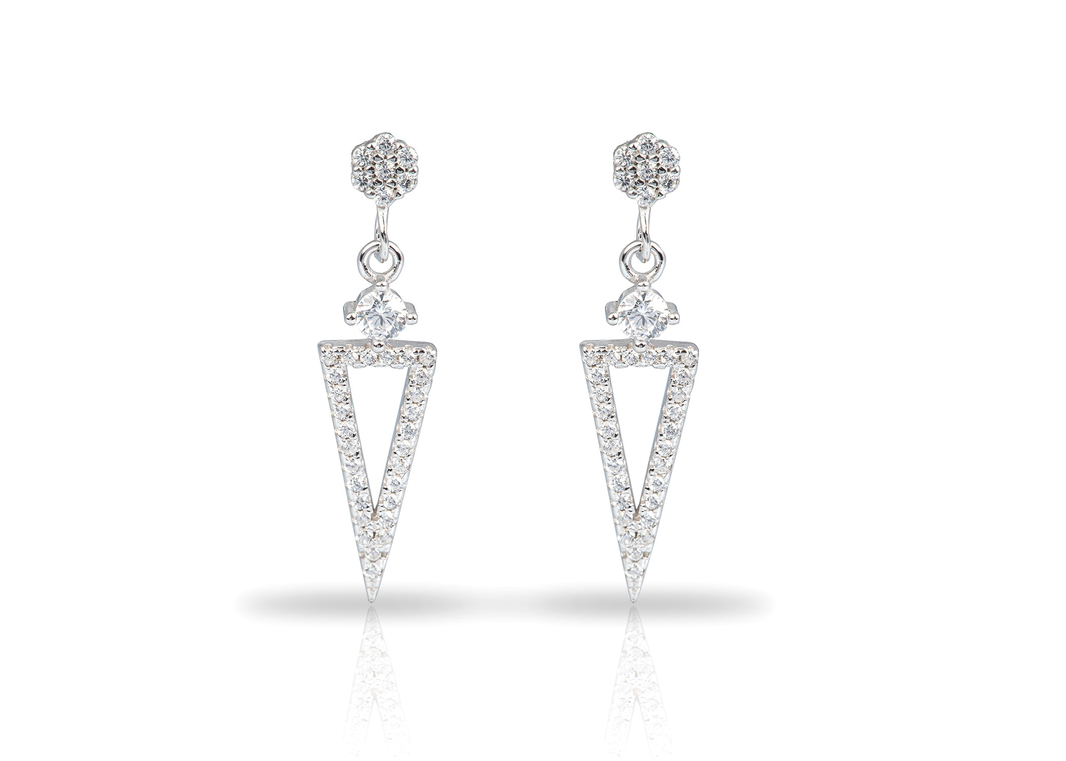 עגילי כסף משולשים נופלים משובצים זירקונים מכסף 925 טהור לאישה. העגילים משובצים בזירקוני AAAA בחיתוך יהלום. מצופה ברודיום להגנה מפני התחמצנות ושריטות. המוצר מגיע באריזת מתנה מהודרת וממותגת! חצי שנה אחריות.