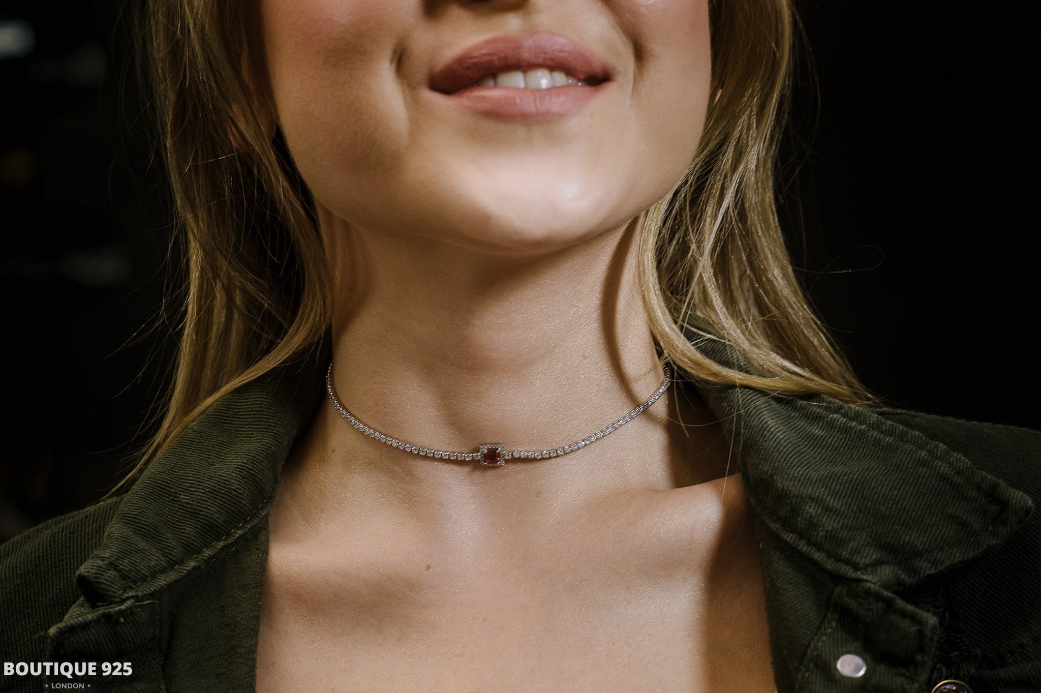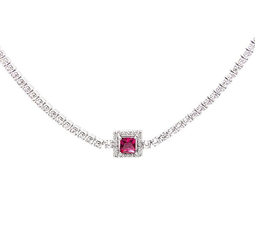 צ'וקר טניס עם אלמנט מרובע ורוד משובץ בזירקונים מכסף 925 טהור לאישה. השרשרת משובצת בזירקוני AAAA בחיתוך יהלום. מצופה ברודיום להגנה מפני התחמצנות ושריטות. המוצר מגיע באריזת מתנה מהודרת וממותגת! חצי שנה אחריות.