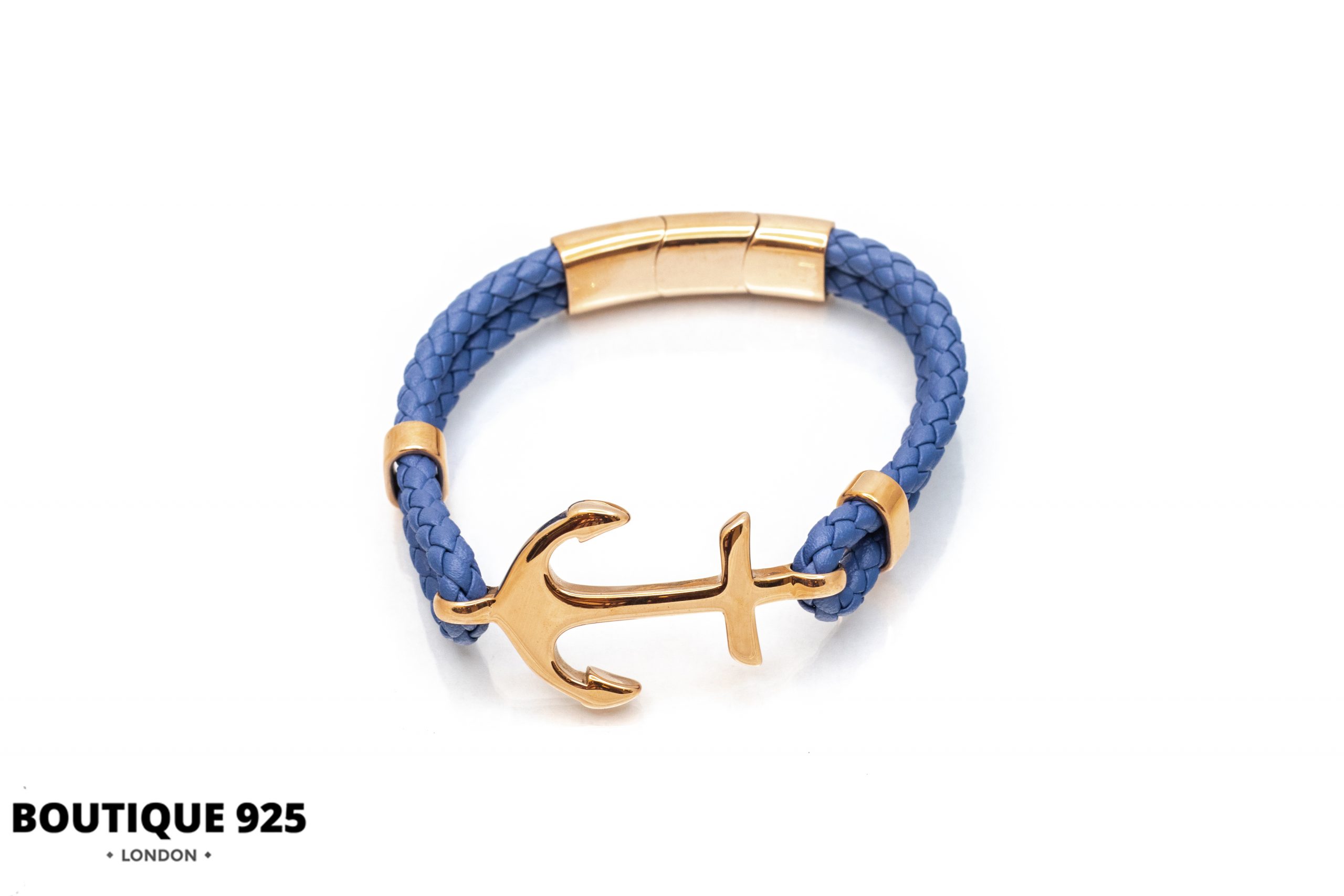 צמיד עם אלמנט עוגן Stainless steel, רצועה דמוי עור כחולה. המוצר מגיע באריזת מתנה ממותגת! חצי שנה אחריות.