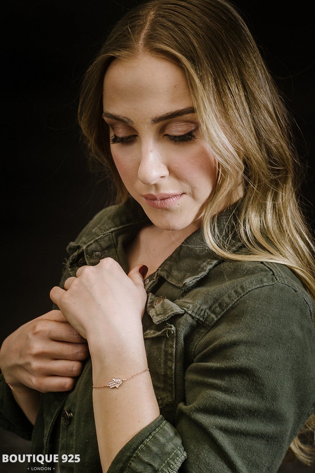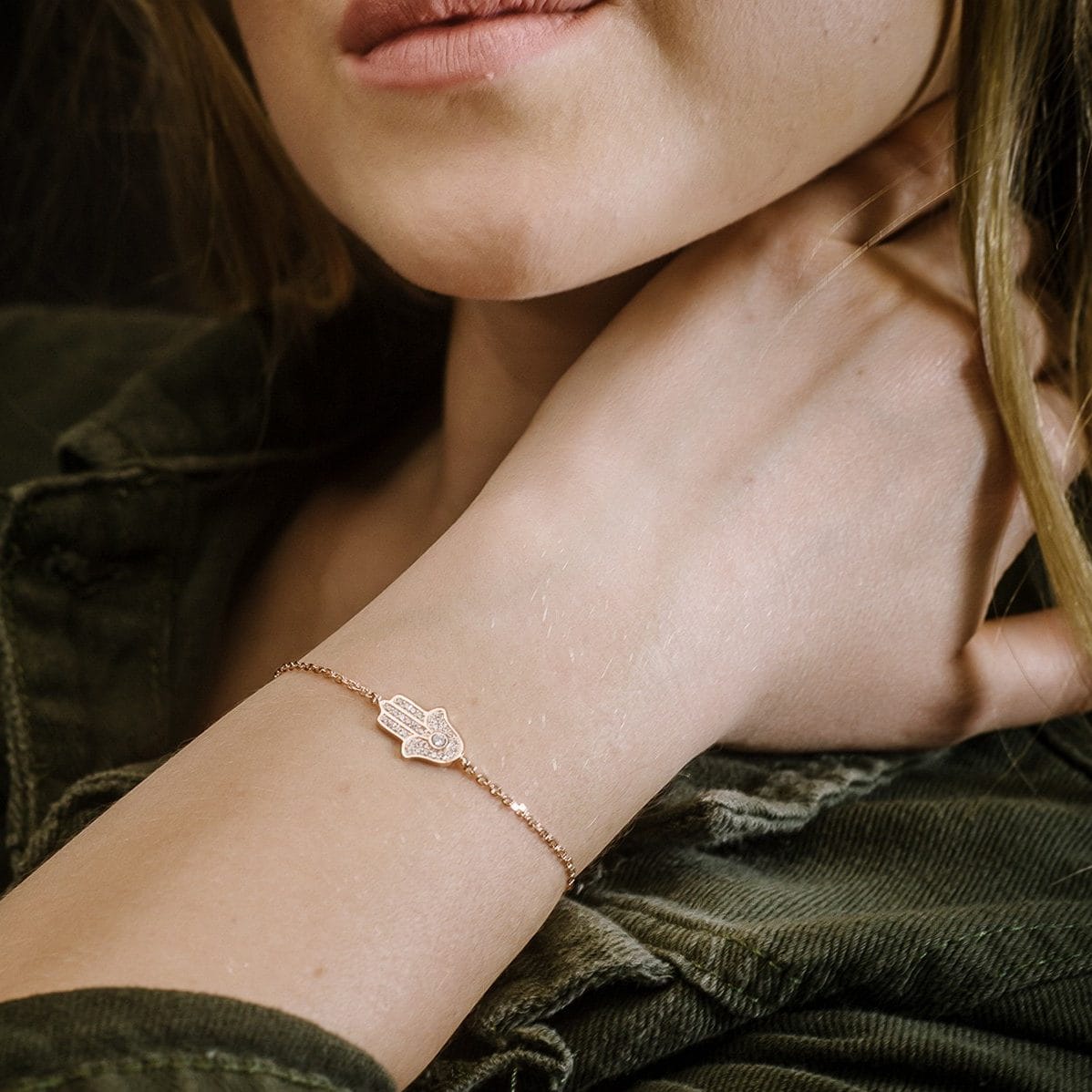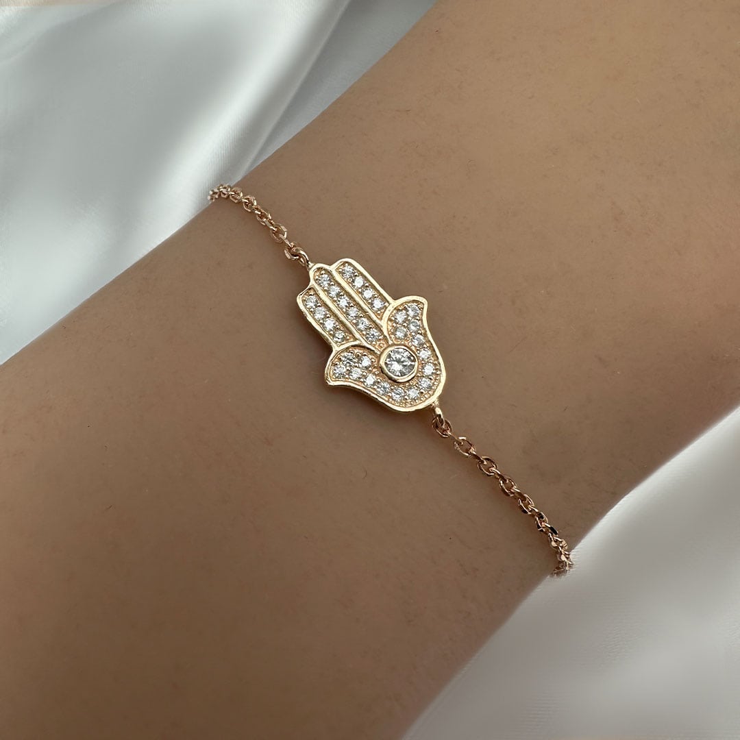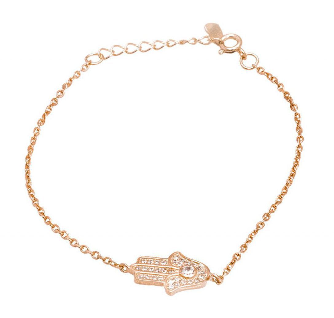 צמיד חמסה רוז גולד עם אבן משובצת זירקונים מכסף 925 טהור לאישה. הצמיד משובץ בזירקוני AAAA בחיתוך יהלום. המוצר מגיע באריזת מתנה ממותגת ומהודרת! חצי שנה אחריות.