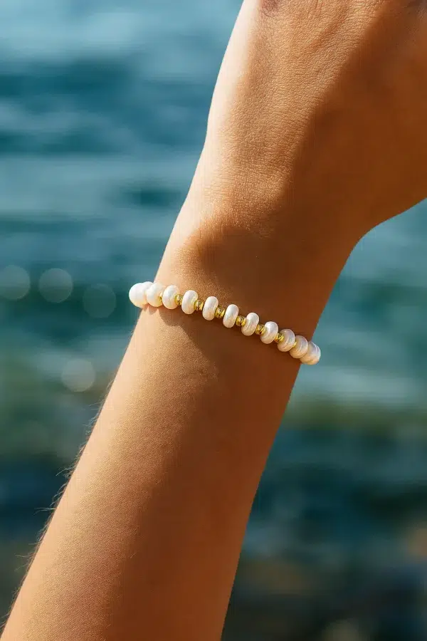צמיד נמתח עם חרוזי צדפים בצבע לבן וחרוזים בצבע זהב. הצמיד בגיע באריזת מתנה מהודרת וממותגת עם מטלית לניקוי תכשיטים ללא עלות