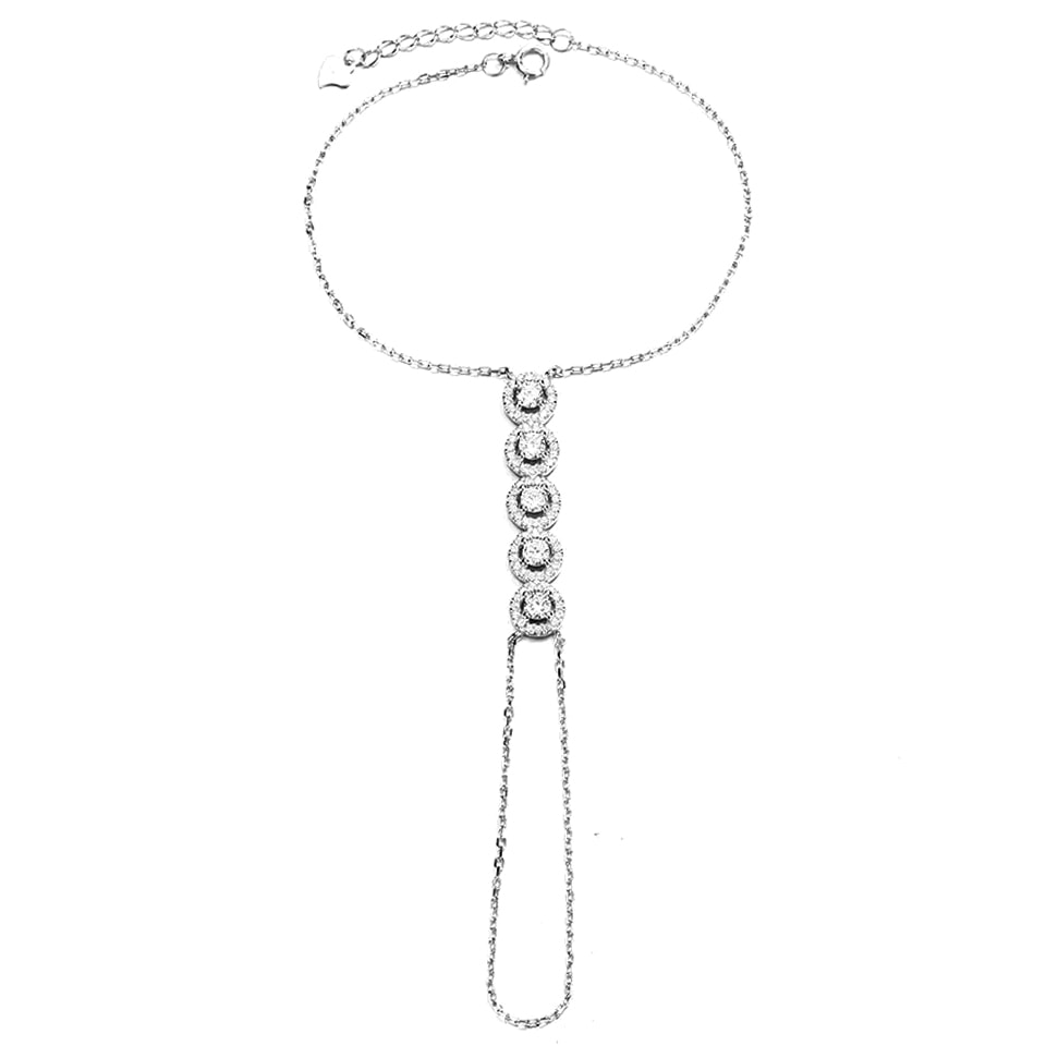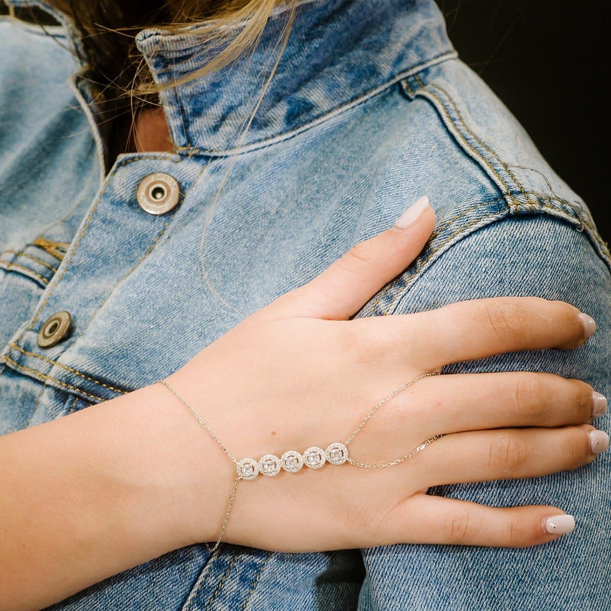 לצמיד מחוברת שרשרת שמתחברת לטבעת הנענדת על אחת האצבעות, ויוצרת הרמוניה לתכשיט מקסים שמושך את העין.