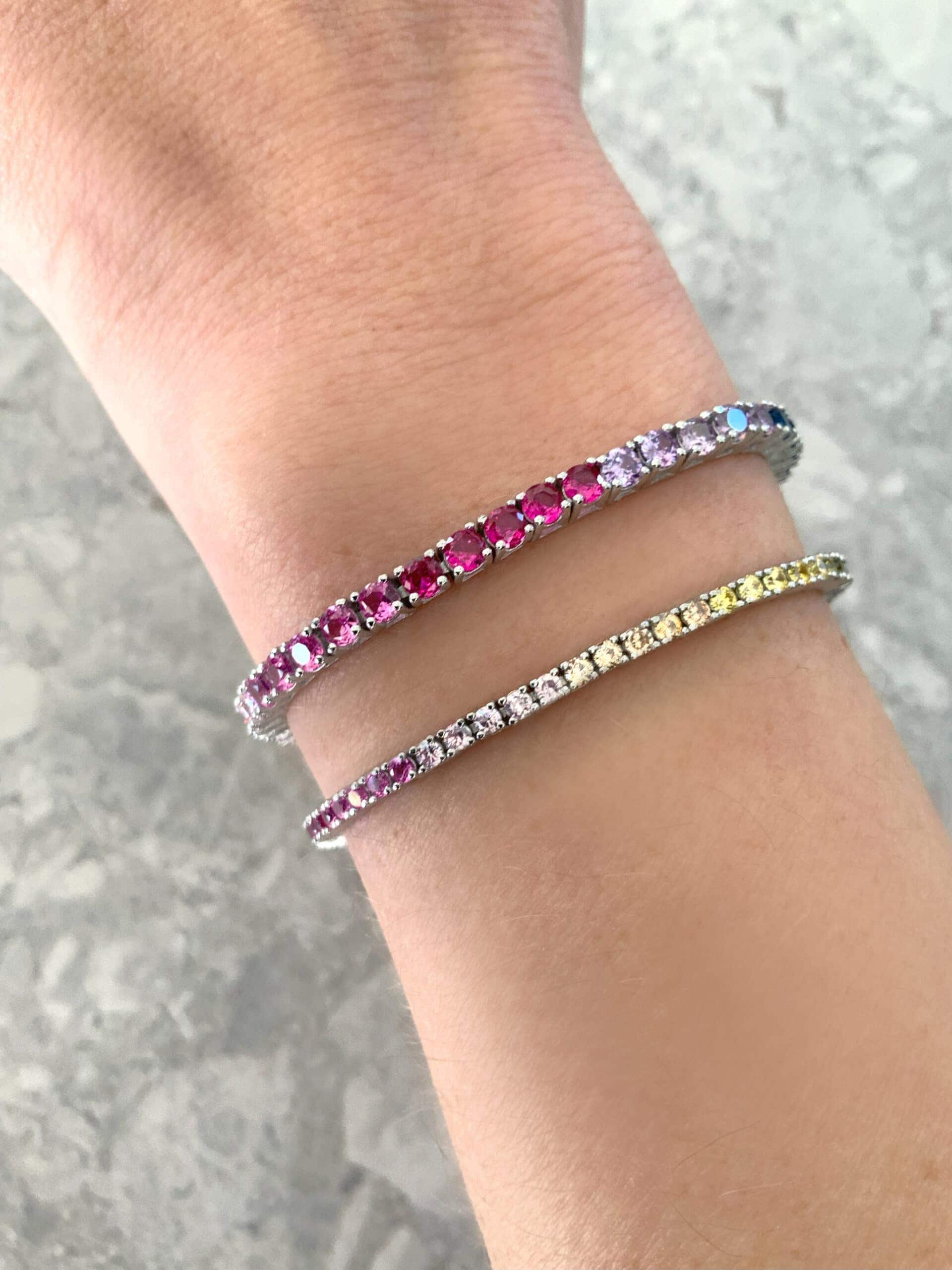 צמיד טניס צבעוני מכסף 925 טהור. מצופה ברודיום להגנה מפני התחמצנות ושריטות.