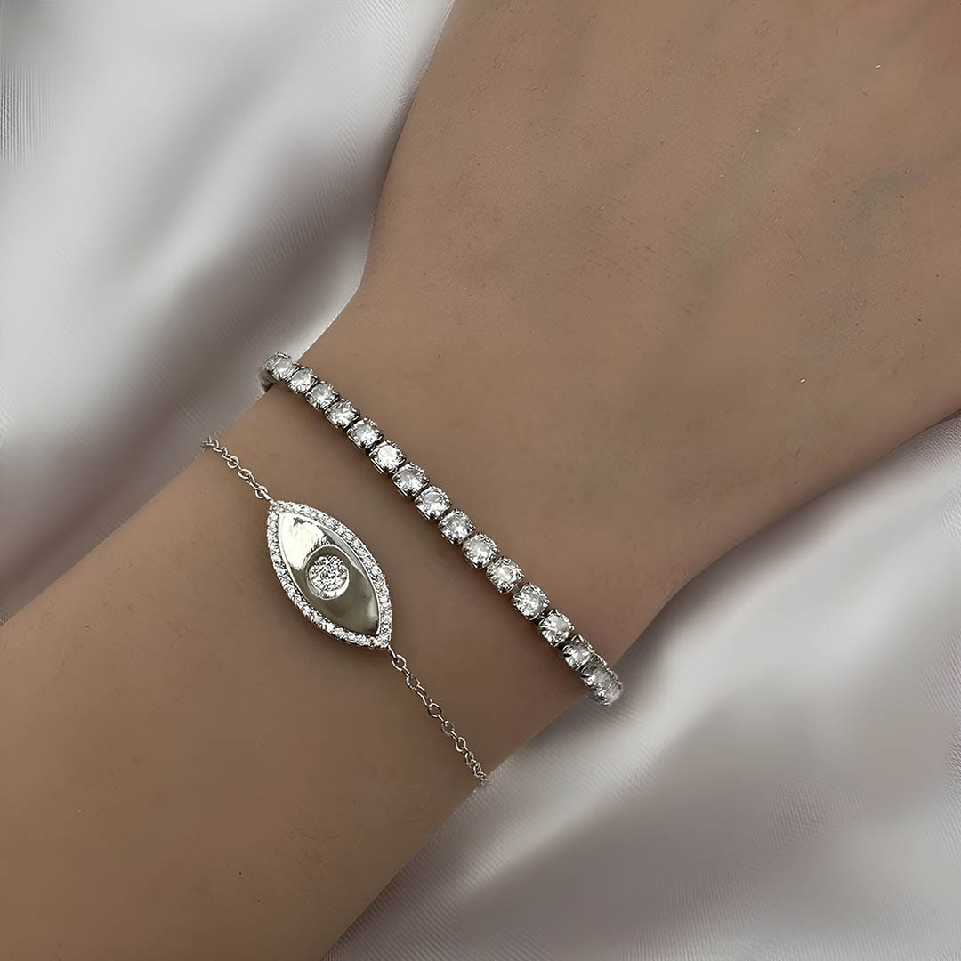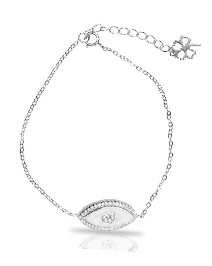 צמיד כסף עין מבריקה משובצת זירקונים מכסף 925 טהור לאישה. הצמיד משובץ בזירקוני AAAA בחיתוך יהלום. מצופה ברודיום להגנה מפני התחמצנות ושריטות. המוצר מגיע באריזת מתנה ממותגת ומהודרת! חצי שנה אחריות.