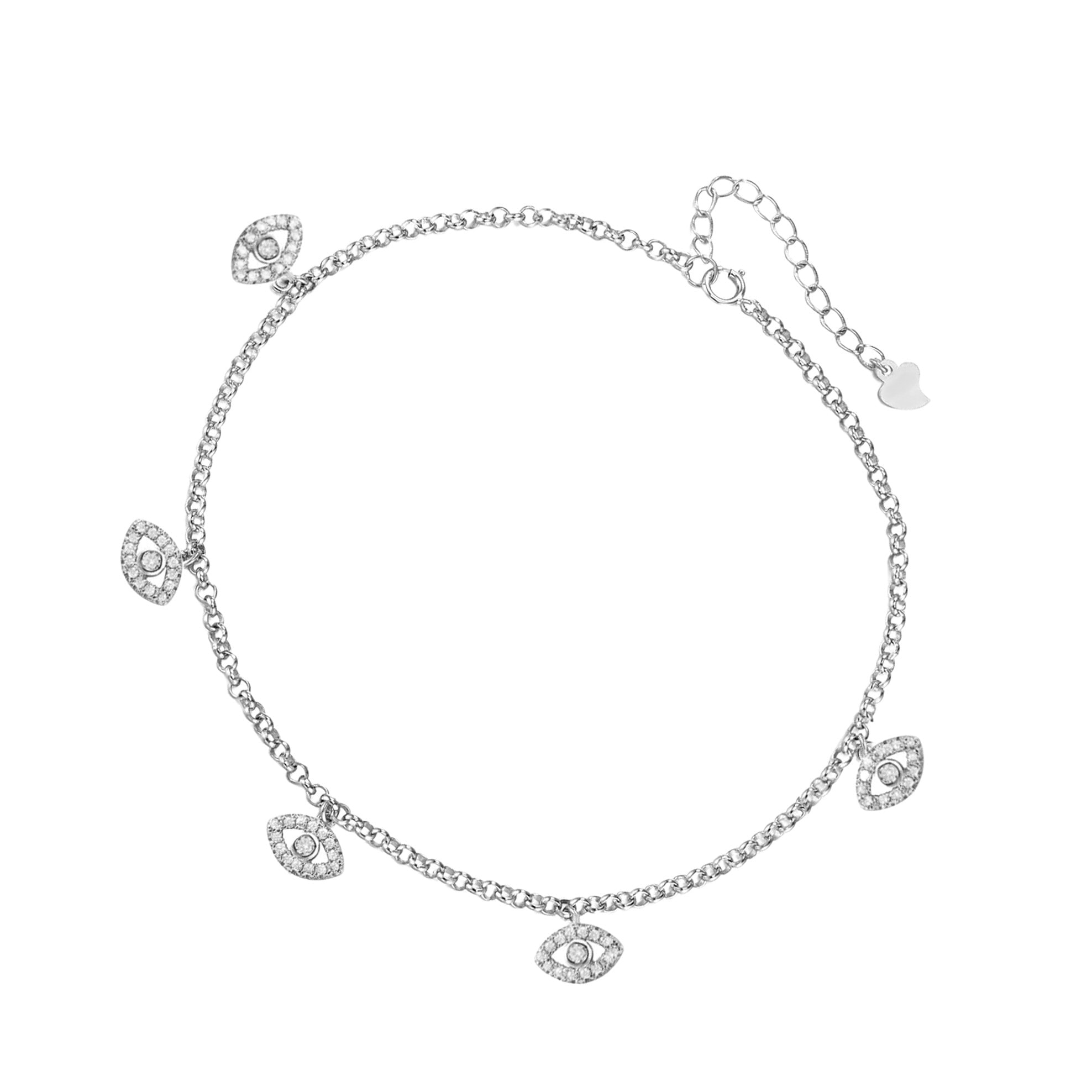 צמיד לרגל עיניים נוצצות משובצות זירקונים מכסף 925 טהור לאישה. הצמיד משובץ בזירקוני AAAA בחיתוך יהלום. מצופה ברודיום להגנה מפני התחמצנות ושריטות. המוצר מגיע באריזת מתנה ממותגת ומהודרת! חצי שנה אחריות.