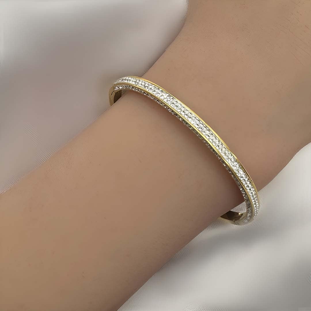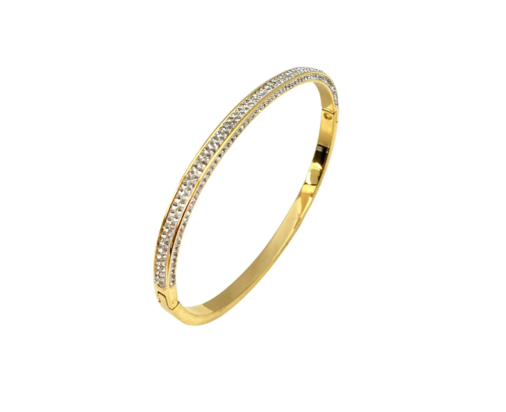 צמיד מ-Stainless Steel צבע זהב משובץ זירקונים. הצמיד משובץ בזירקוני AAAA בחיתוך יהלום. המוצר מגיע באריזת מתנה ממותגת ומהודרת! חצי שנה אחריות.
