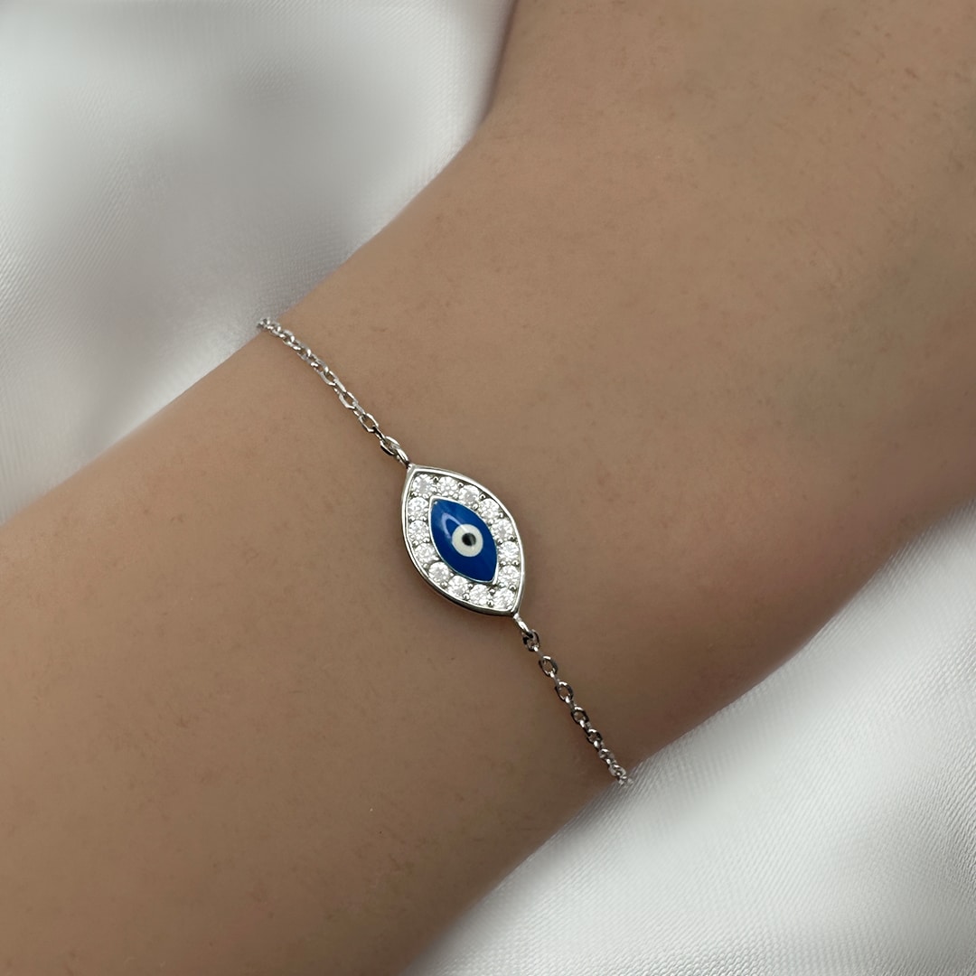 צמיד עין כחולה משובץ זירקונים מכסף 925 טהור לאישה. הצמיד משובץ בזירקוני AAAA בחיתוך יהלום. מצופה ברודיום להגנה מפני התחמצנות ושריטות. המוצר מגיע באריזת מתנה ממותגת ומהודרת! חצי שנה אחריות.