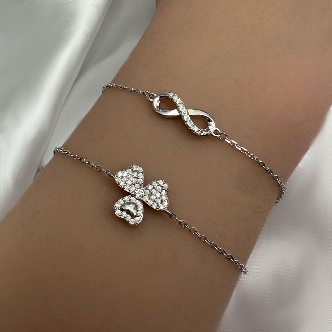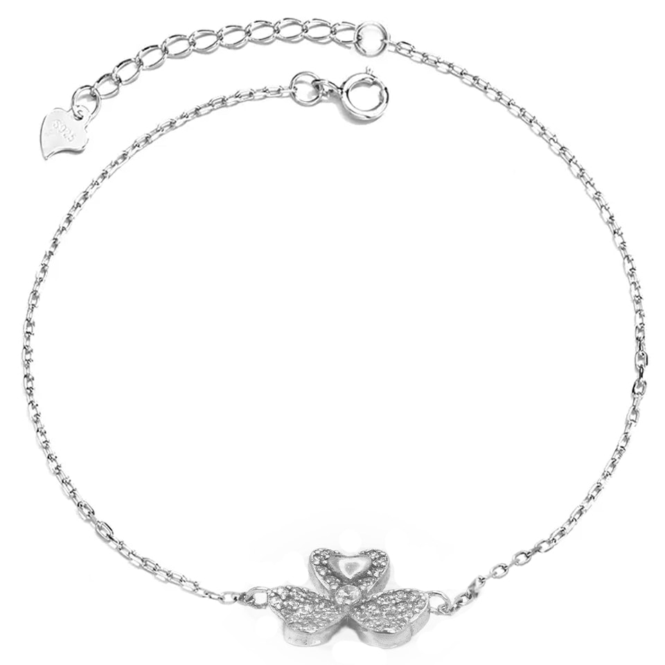 צמיד כסף תלתן עם אלמנט לב משובץ בזירקונים מכסף 925 טהור לאישה. הצמיד משובץ בזירקוני AAAA בחיתוך יהלום. מצופה ברודיום להגנה מפני התחמצנות ושריטות. המוצר מגיע באריזת מתנה ממותגת ומהודרת! חצי שנה אחריות.