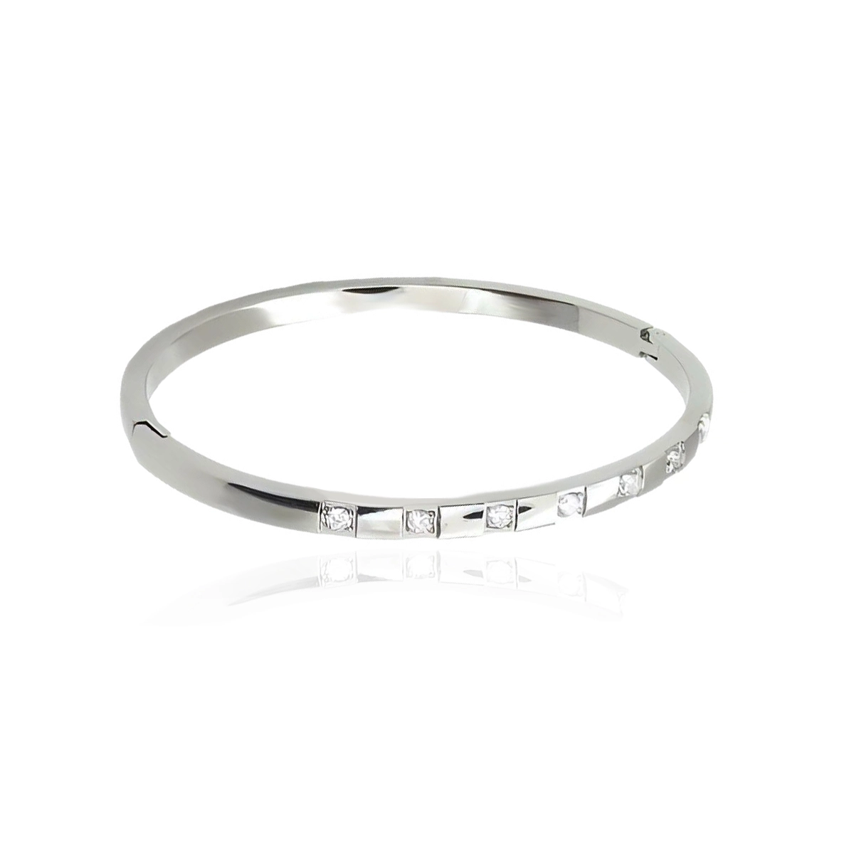 צמיד קשיח בצבע כסף משובץ זירקונים עגולים שקופים. הצמיד עשוי סטיינלס לא משחיר ולא מוריד צבע.