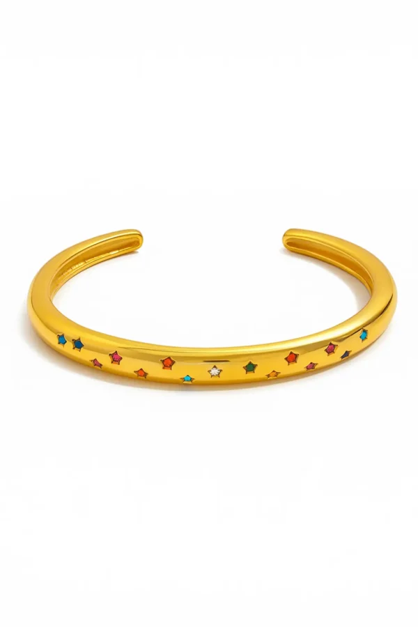 צמיד קשיח בצבע זהב משובץ זירקונים צבעוניים. הצמיד עשוי סטיינלס סטיל. לא משחיר ולא מוריד צבע.