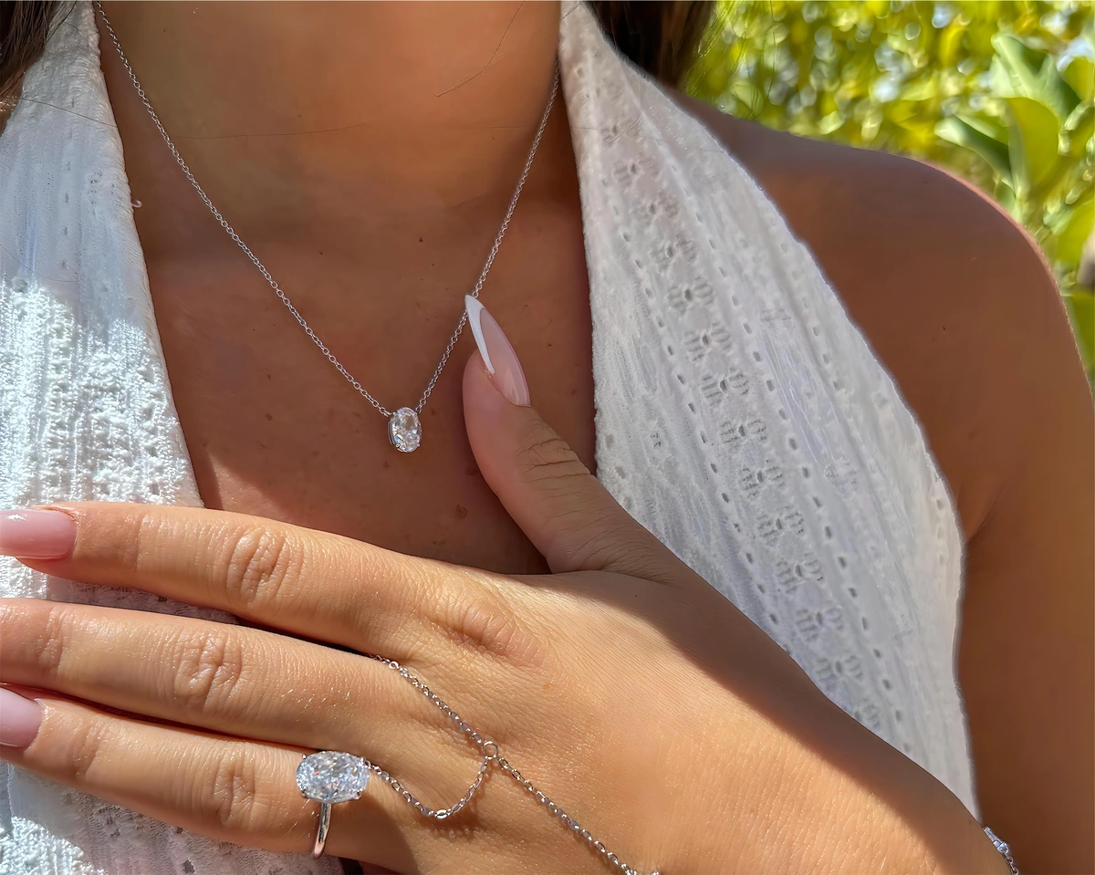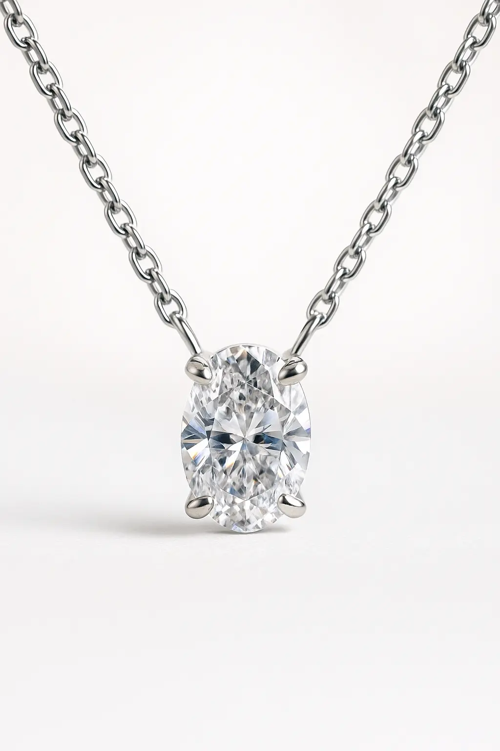 שרשרת שבמרכזה שובץ זירקון מרהיב בדרגת 8A. זירקון אליפטי שנחתך בחיתוך רדיאנט. כל חיתוך מפזר ניצוץ מזוויות שונות בכל תזוזה עדינה של הצוואר.
