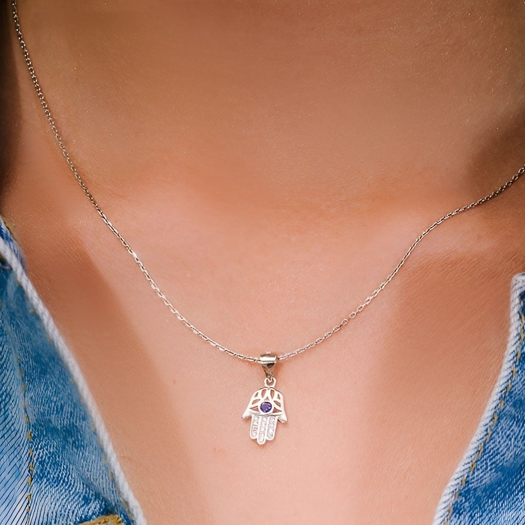 עמוד הבית>תכשיטי נשים>קולקציית חמסה - תכשיטי חמסה מעוצבים>שרשרת חמסה מכסף משובצת זרקון כחול וזירקונים