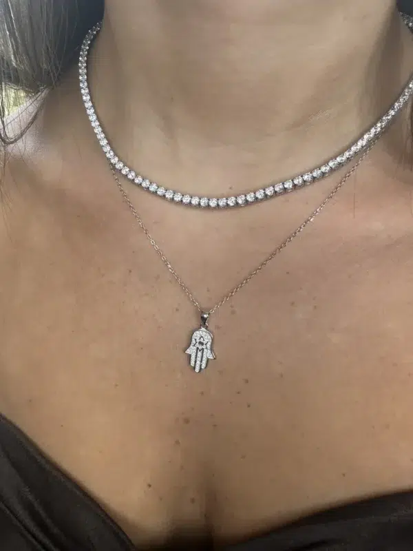 שרשרת חמסה עם מגן דוד מכסף 925 טהור לאישה. החמסה משובת בזירקונים ובאמצע מתגלה מגן דוד משובץ