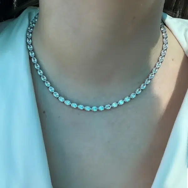 הדוגמנית שלנו עונדת שרשרת טניס בעיצוב אובלי מרהיב באורך 40 ס"מ.