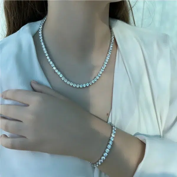 הדוגמנית בתמונות עונדת שרשרת טניס מידה 40 ס"מ.