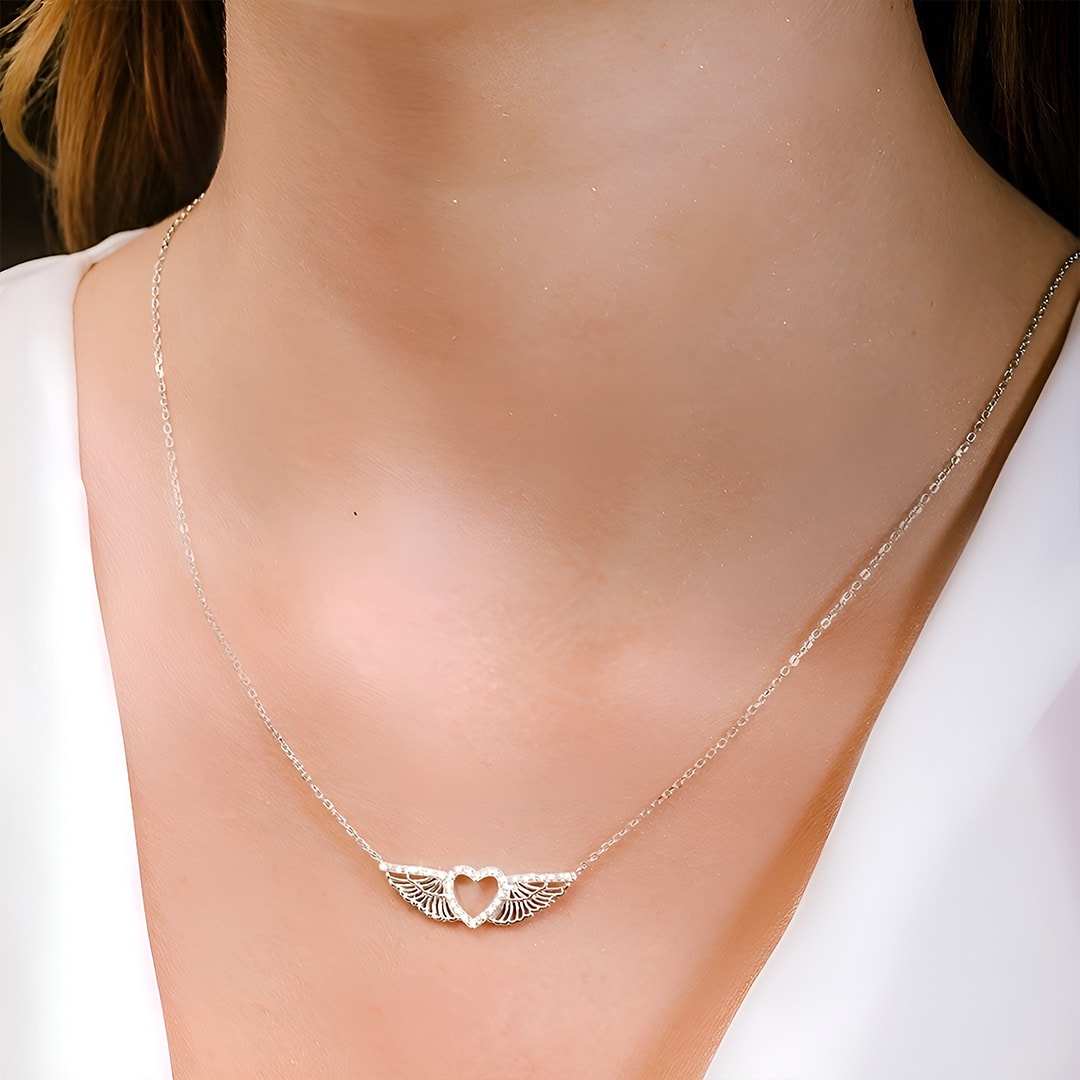 שרשרת כנפיים עם לב מכסף משובצת זירקונים